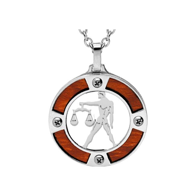 Collier acier pendentif rond zodiaque balance aspect bois clair et vis cruciforme 50+5cm