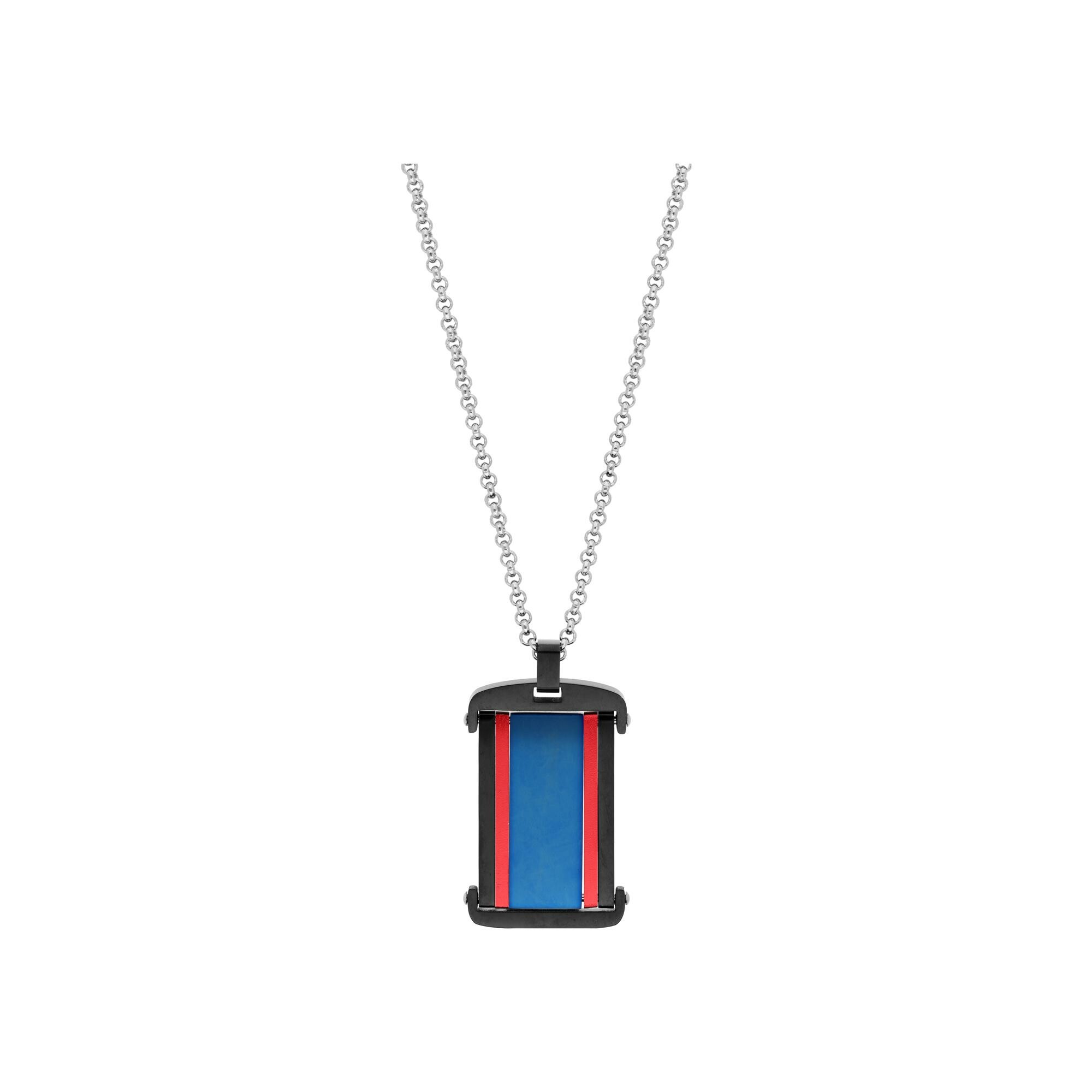 Collier acier chaîne avec pendentif rectangulaire pvd noir et bleu avec bande rouge aluminium 50+5cm Description détaillée