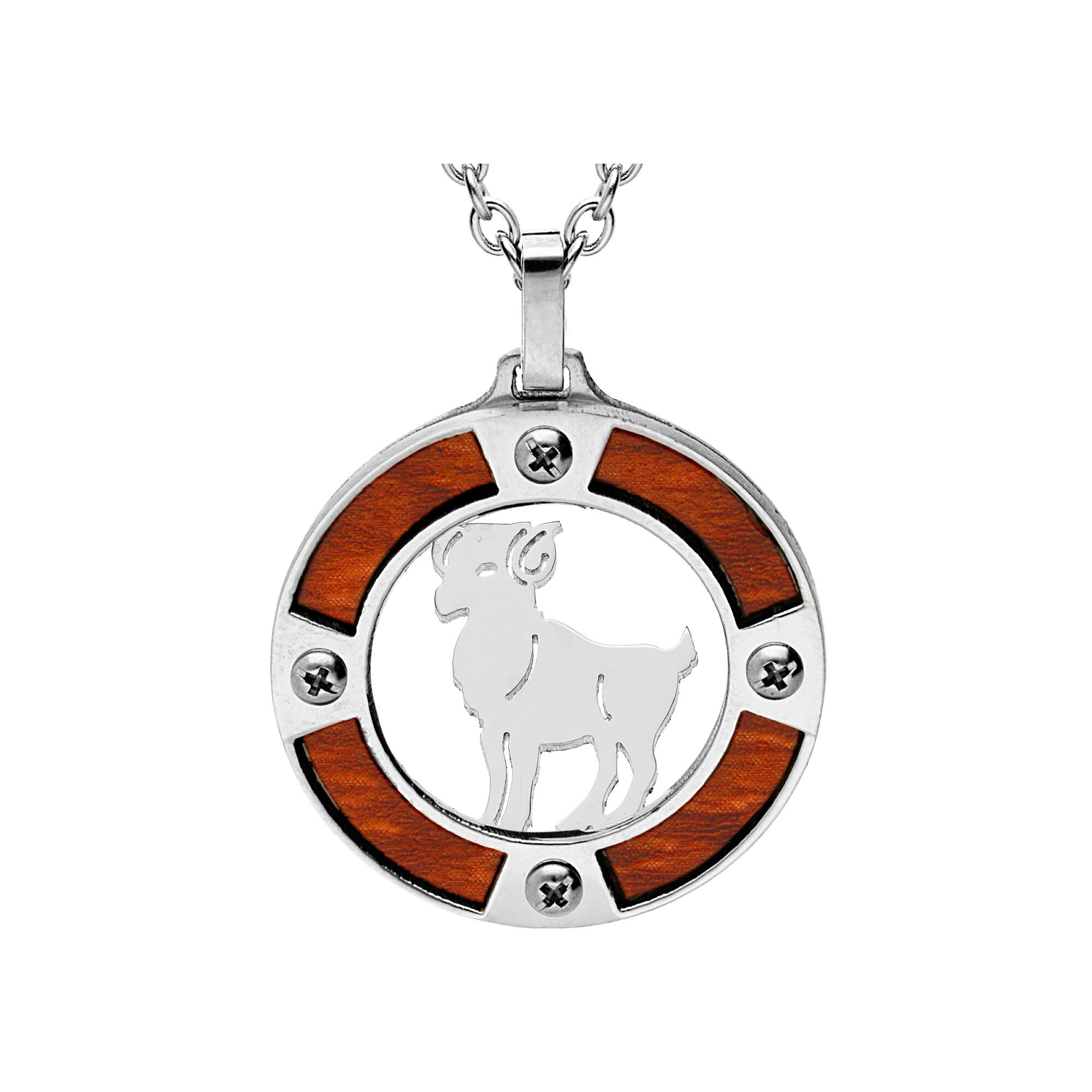 Collier acier pendentif rond zodiaque belier aspect bois clair et vis cruciforme 50+5cm Description détaillée