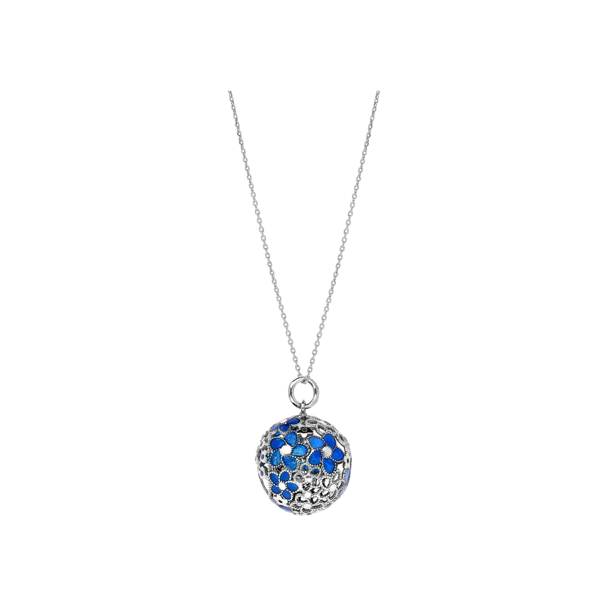 Collier argent rhodié bola de grossesse grosse boule ajourée fleurs bleues 90+10cm Description détaillée