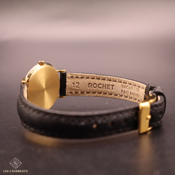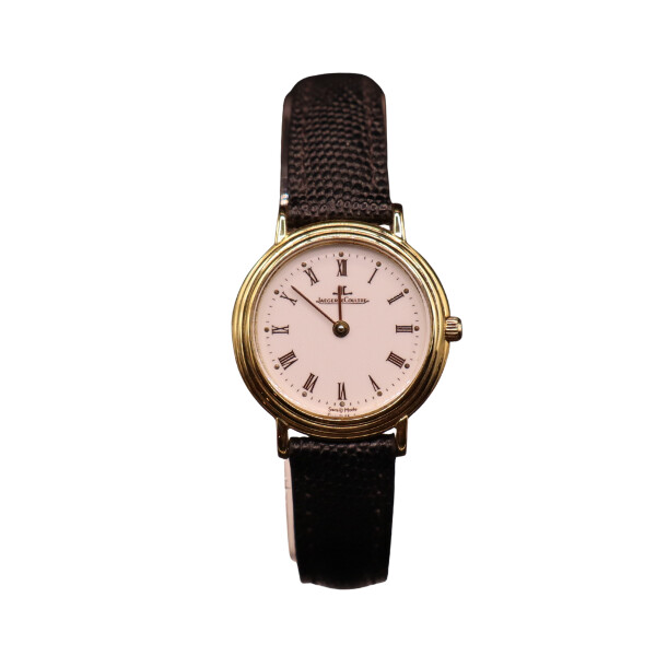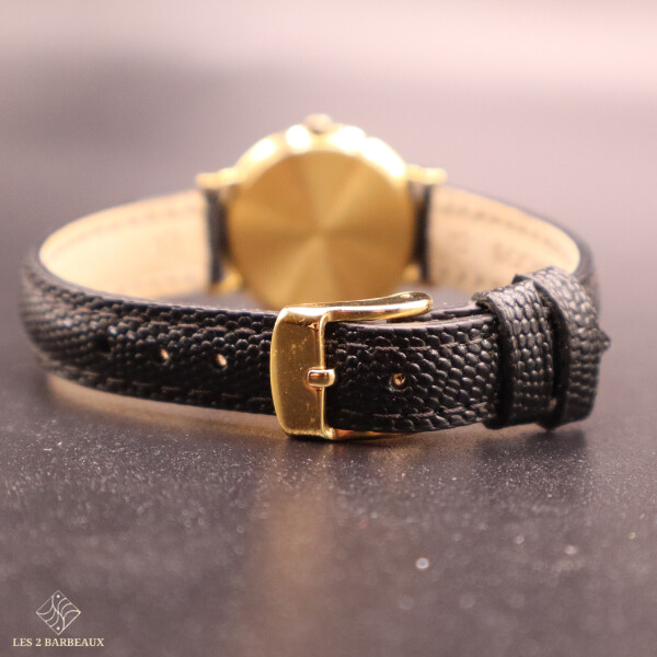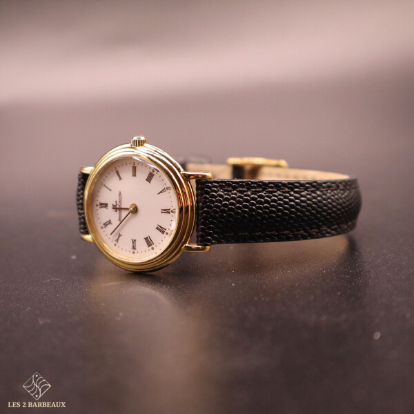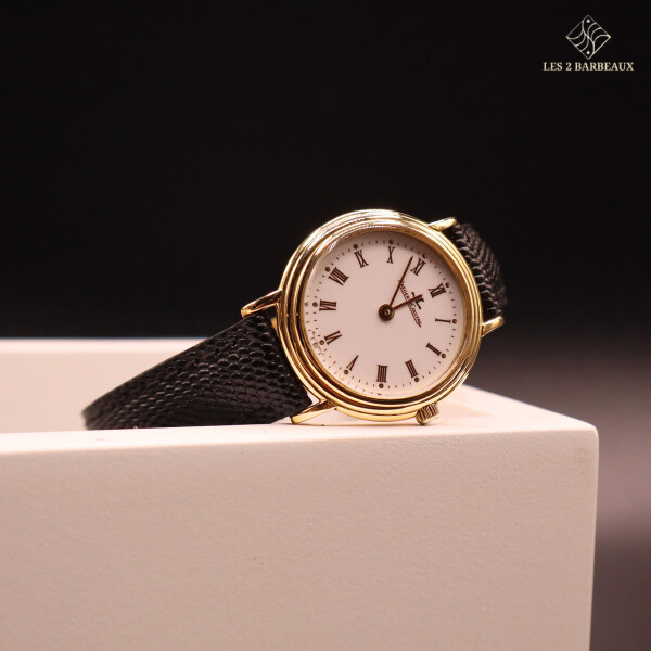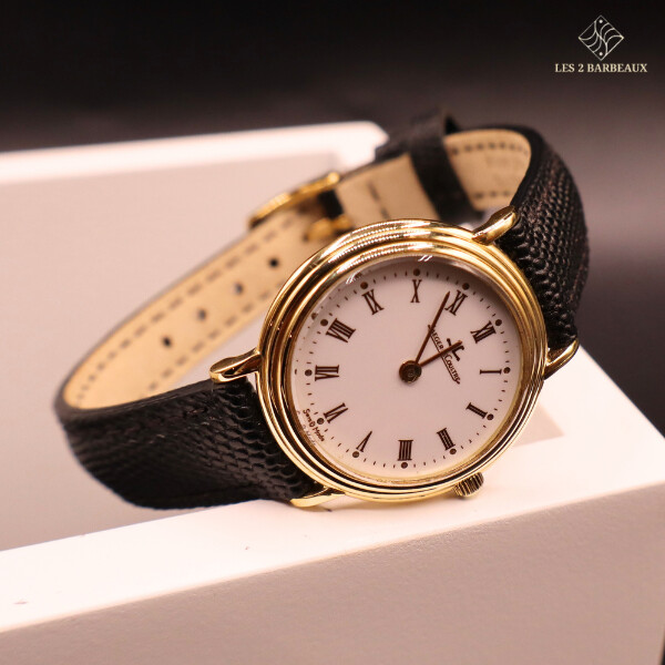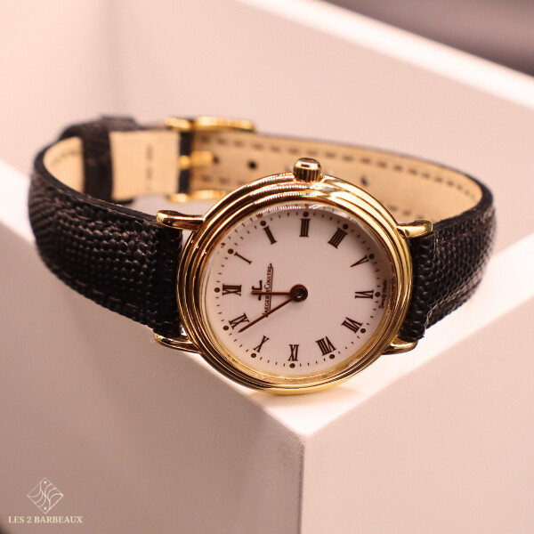 Superbe montre Jaeger-LeCoultre pour femme, entièrement réalisée en or jaune, alliant raffinement horloger et élégance intemporelle. Ce modèle vintage, datant des années 1990-2000, incarne le savoir-faire de la maison dans une silhouette sobre et précieuse, pensée pour sublimer le poignet au quotidien comme lors des grandes occasions.