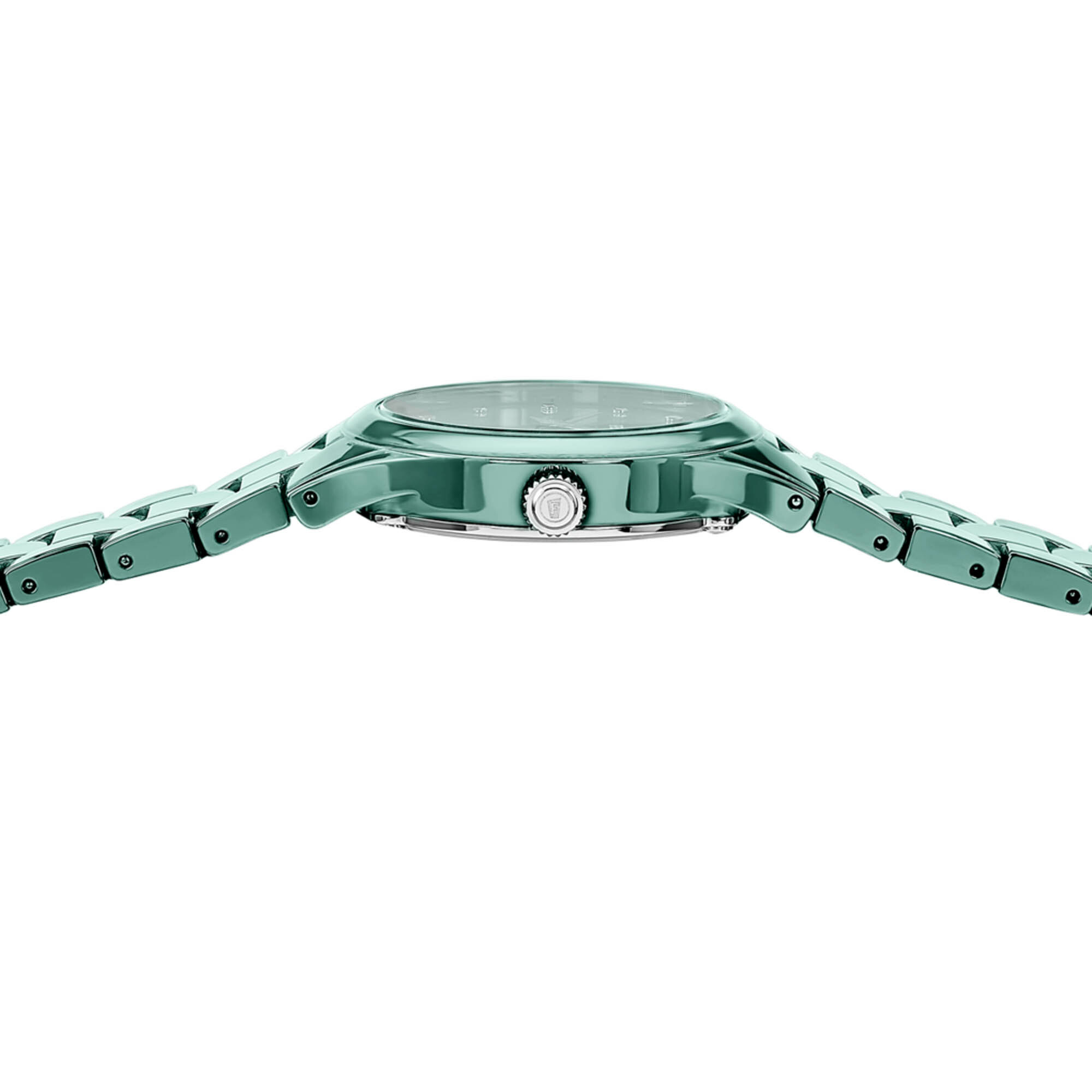 Son boîtier rond d’environ 30,5 mm, associé à un bracelet en céramique assorti, assure une silhouette harmonieuse et un confort optimal au poignet. Léger et résistant, ce matériau est apprécié pour sa durabilité et son éclat. Le cadran vert, rehaussé d’index délicats et parfois ornés de cristaux, garantit une lisibilité claire tout en apportant une touche subtile de sophistication .