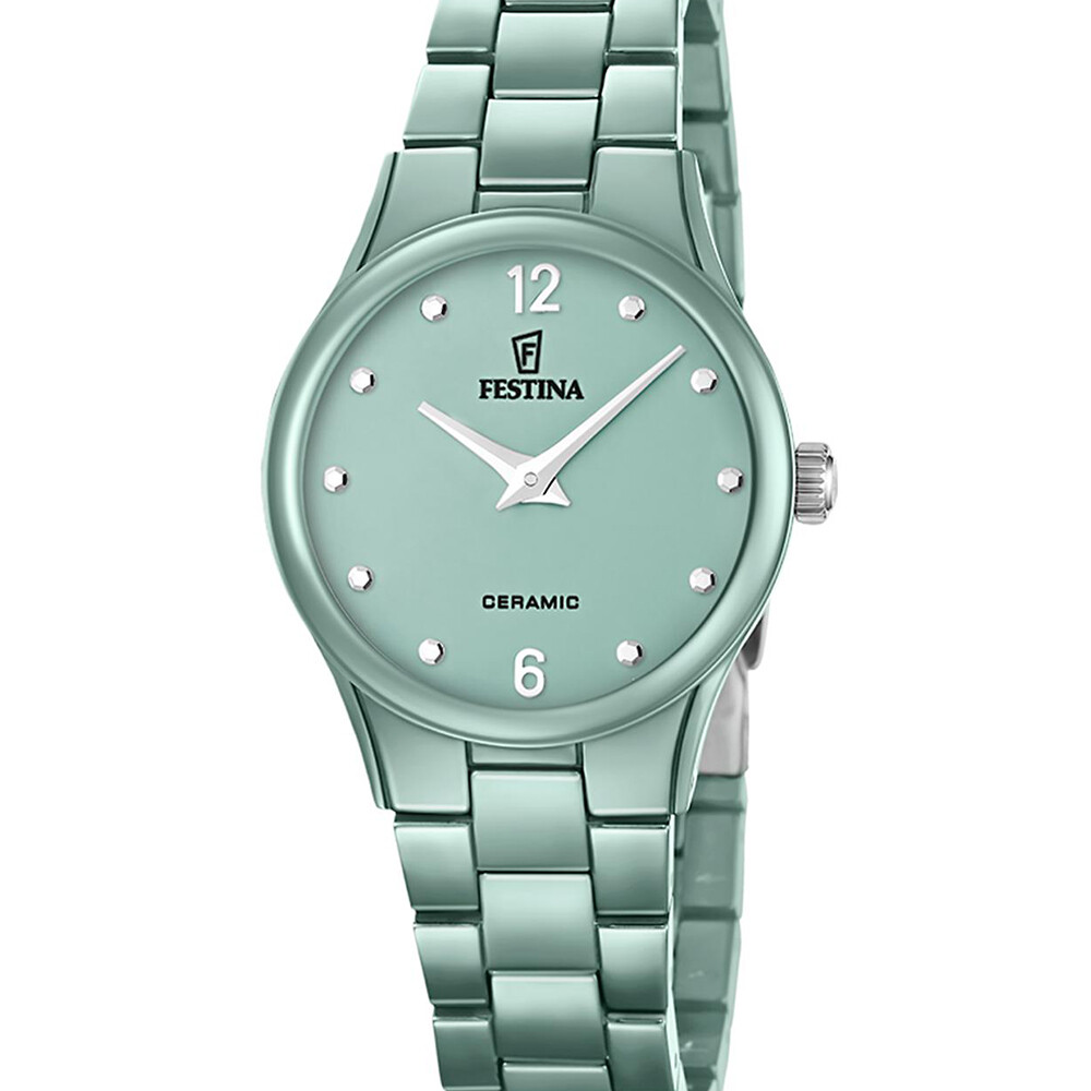 Découvrez la montre Ceramic F20751/3 signée Festina entièrement verte pastel, une pièce féminine au design contemporain qui séduit par son élégance naturelle. Entièrement habillée de céramique verte, elle offre un style à la fois original et raffiné, parfait pour apporter une touche de fraîcheur et de modernité à toutes vos tenues.