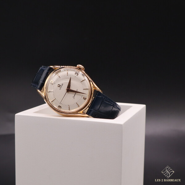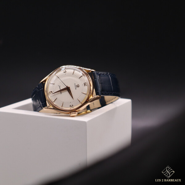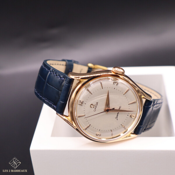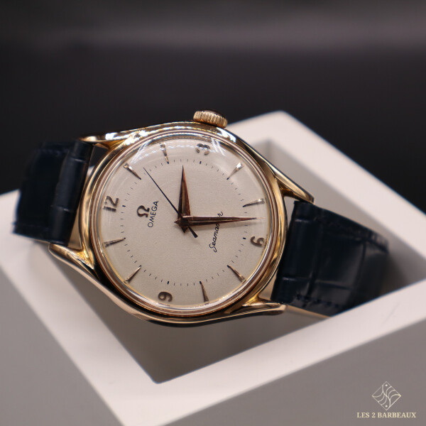 Véritable témoin de l’élégance horlogère des années 1940-1950, cette Omega Seamaster pour homme incarne le raffinement classique et la précision d’antan. Son boîtier en or jaune, entièrement poli, met en valeur un cadran couleur champagne restauré, offrant une lecture chaleureuse et lumineuse du temps.