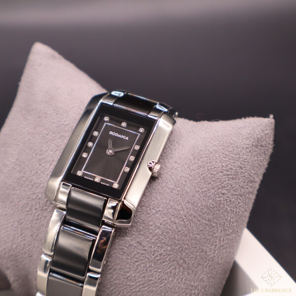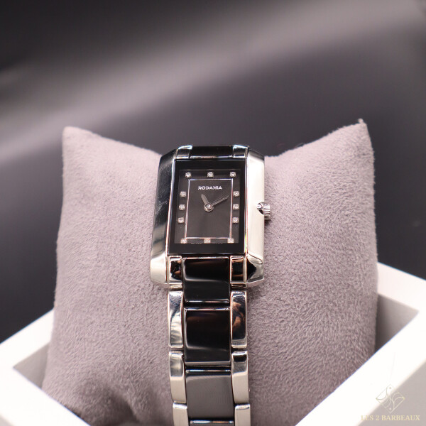 Alliance de modernité et d’éclat, cette montre Rodania pour femme séduit par son design contemporain mêlant acier et céramique noire, rehaussé d’un cadran noir orné de 12 diamants qui captent la lumière avec subtilité.