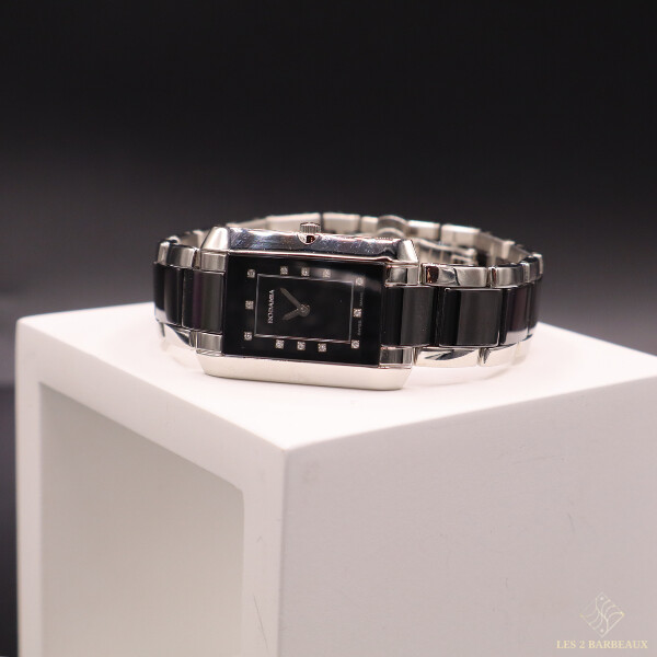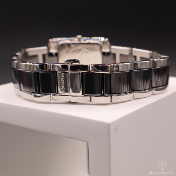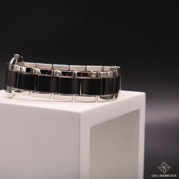 Équipée d’un mouvement quartz suisse, elle garantit précision et fiabilité au quotidien. Son bracelet en acier et céramique noire, parfaitement assorti au boîtier, assure une harmonie élégante et un confort raffiné au poignet.